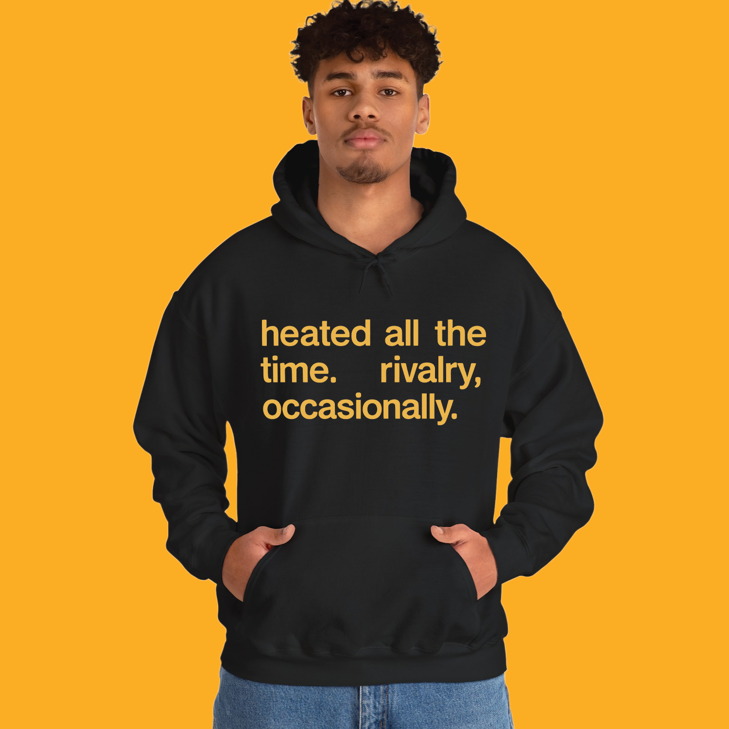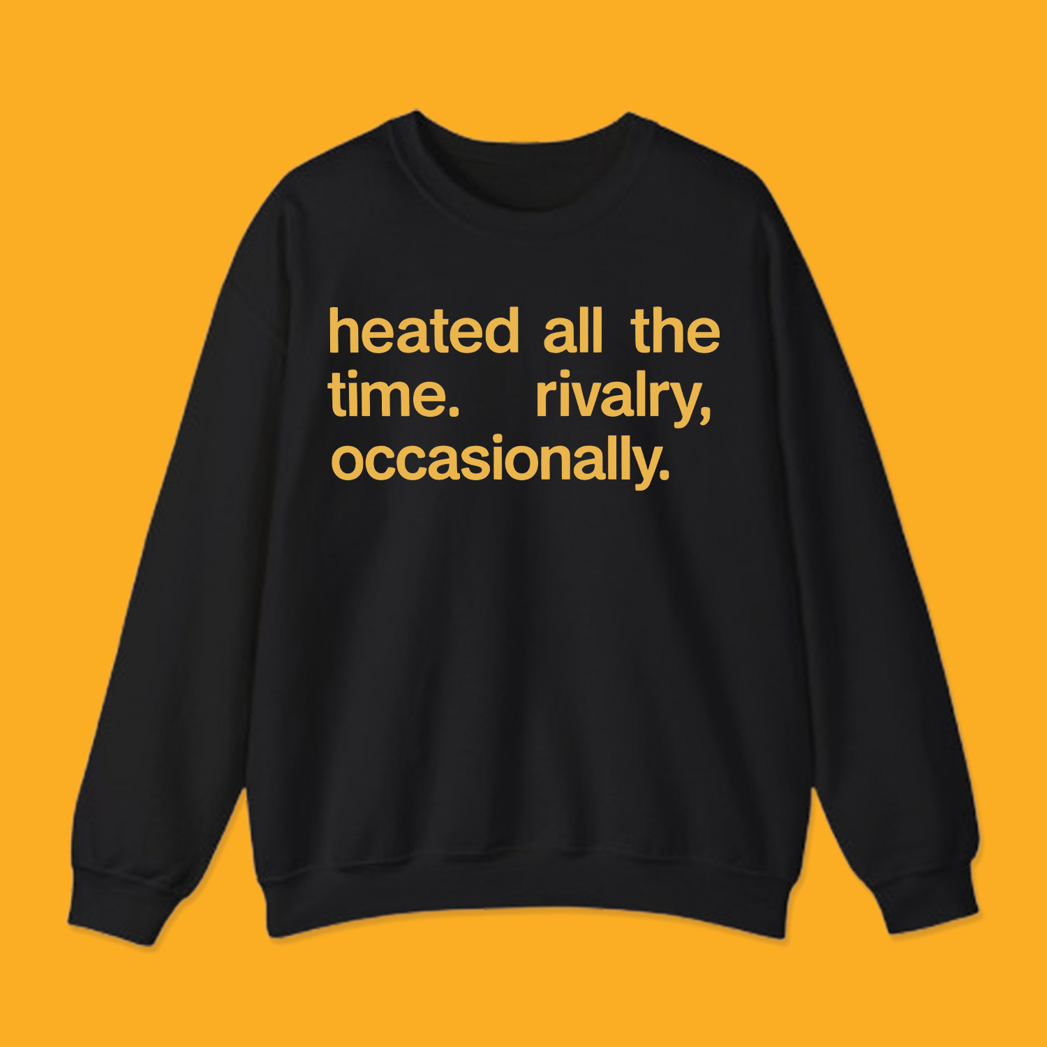 Black unisex crewneck sweatshirt displaying the sarcastic quote heated all the time. rivalry, occasionally. in bold yellow letters.