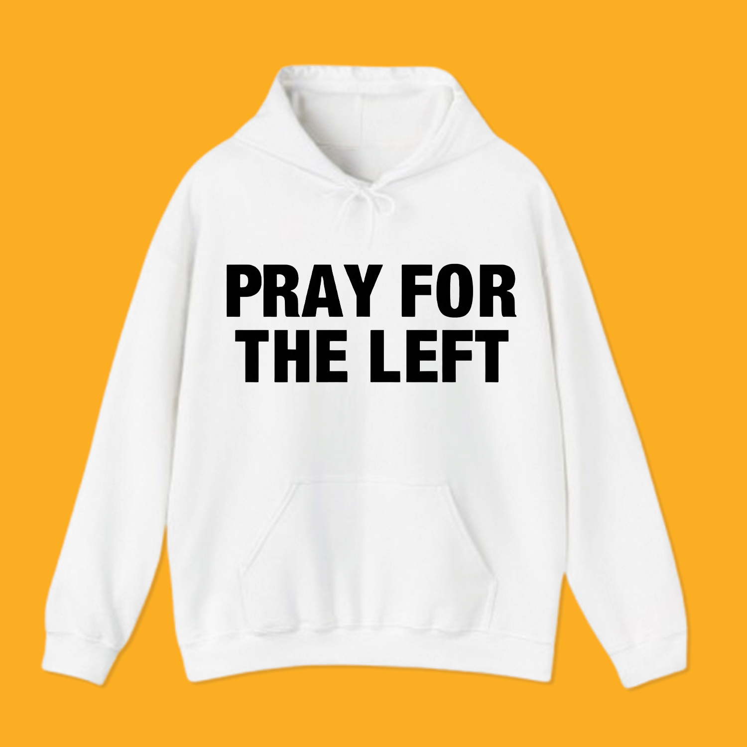 Young man wearing a white "Pray For The Left" bold text hoodie against a yellow background.